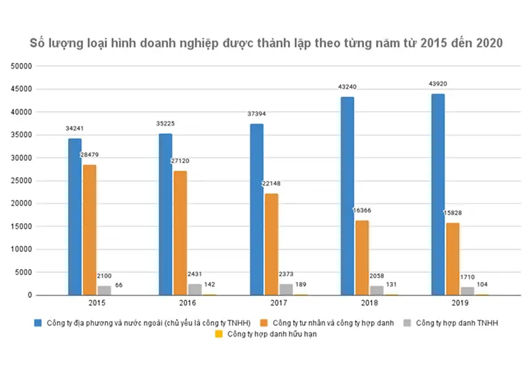 Theo số liệu thống kê cho thấy, ba loại hình được lựa chọn nhiều nhất là công ty TNHH, công ty tư nhân và công ty hợp danh TNHH. Trong đó, công ty trách nhiệm hữu hạn là loại hình mà chúng tôi khuyến khích bạn nhắm đến nhất. Lý do bởi vì công ty TNHH có những ưu điểm vượt trội, trong đó phải kể đến các chương trình ưu đãi về thuế và tiềm năng phát triển tốt hơn so với các loại hình còn lại.